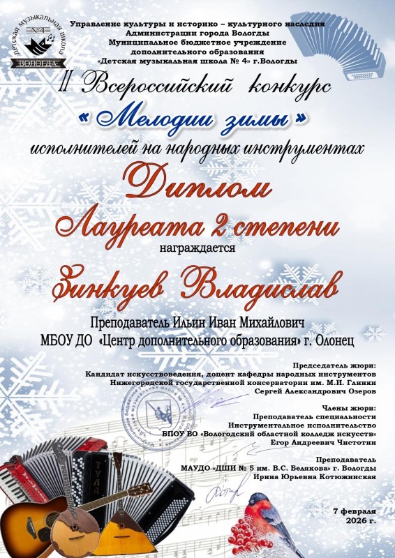 Победа во Всероссийском конкурсе! Подведены итоги II Всероссийского конкурса исполнителей на народных инструментах «Мелодии зимы», который проходил в городе Вологда на базе Детской музыкальной школы № 4. В этом году в конкурсе приняли участие музыканты более чем из 20 регионов России.