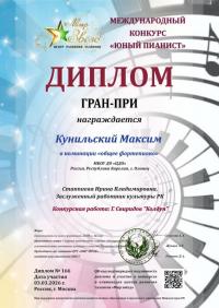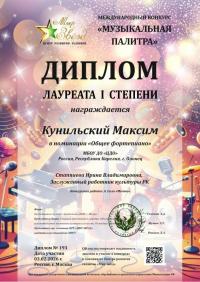 Второклассник музыкального отделения Кунильский Максим дополнил в своё творческое портфолио ещё один весомый Диплом Лауреата l степени Международного конкурса "Музыкальная палитра" по общему курсу фортепиано. Отличное завершение учебного года! Поздравляем Максима и его преподавателя Стаппиеву И.В. с высокой наградой!
