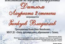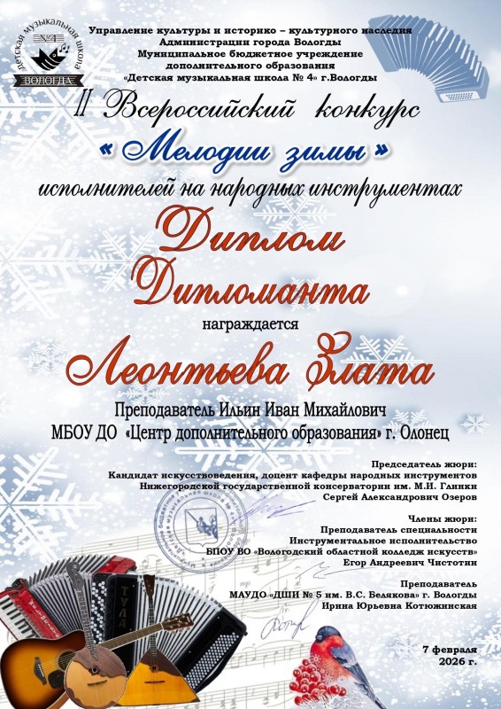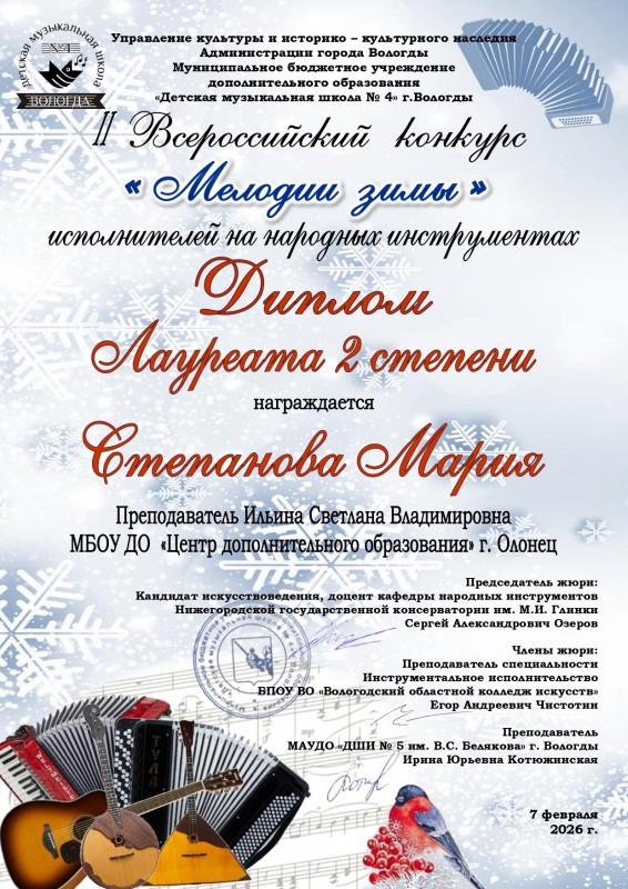 Победа во Всероссийском конкурсе! Подведены итоги II Всероссийского конкурса исполнителей на народных инструментах «Мелодии зимы», который проходил в городе Вологда на базе Детской музыкальной школы № 4. В этом году в конкурсе приняли участие музыканты более чем из 20 регионов России.