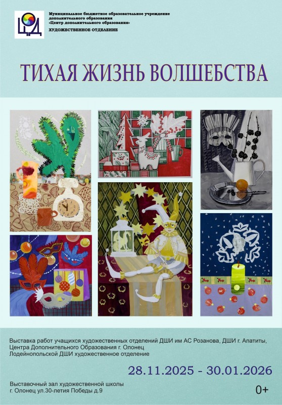 Скоро Новогодние праздники. Чтобы поднять себе настроение и окунуться в атмосферу праздника, приглашаем вас посетить нашу выставку! В выставочном пространстве художественного отделения Центра дополнительного образования открылась уникальная экспозиция работ детей и преподавателей на тему новогоднего натюрморта под названием «Тихая жизнь волшебства». Вы увидите разнообразные произведения искусства, выполненные учащимися и педагогами художественных отделений: