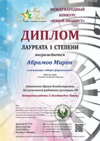Абрамов Мирон и Кунильский Максим стали победителями сразу в нескольких музыкальных конкурсах международного масштаба, получив звание Лауреата I степени в номинациях «Общее фортепиано» и «Молодой композитор». Кроме того, Максим завоевал Гран-при на международном конкурсе «Юный пианист». Участие в конкурсах и концертной деятельности стимулирует ребят продолжать обучение, рождает интерес к публичным выступлениям и повышает самооценку.Поздравляем!